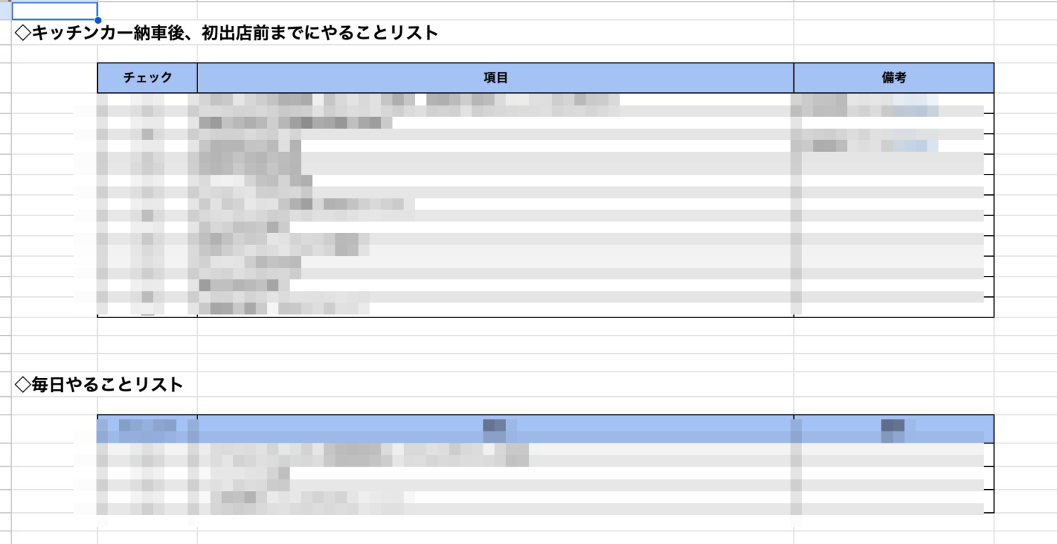 キッチンカー納車後から初出店までの手順を一覧化。毎日のルーティンチェックリストも付属しています。